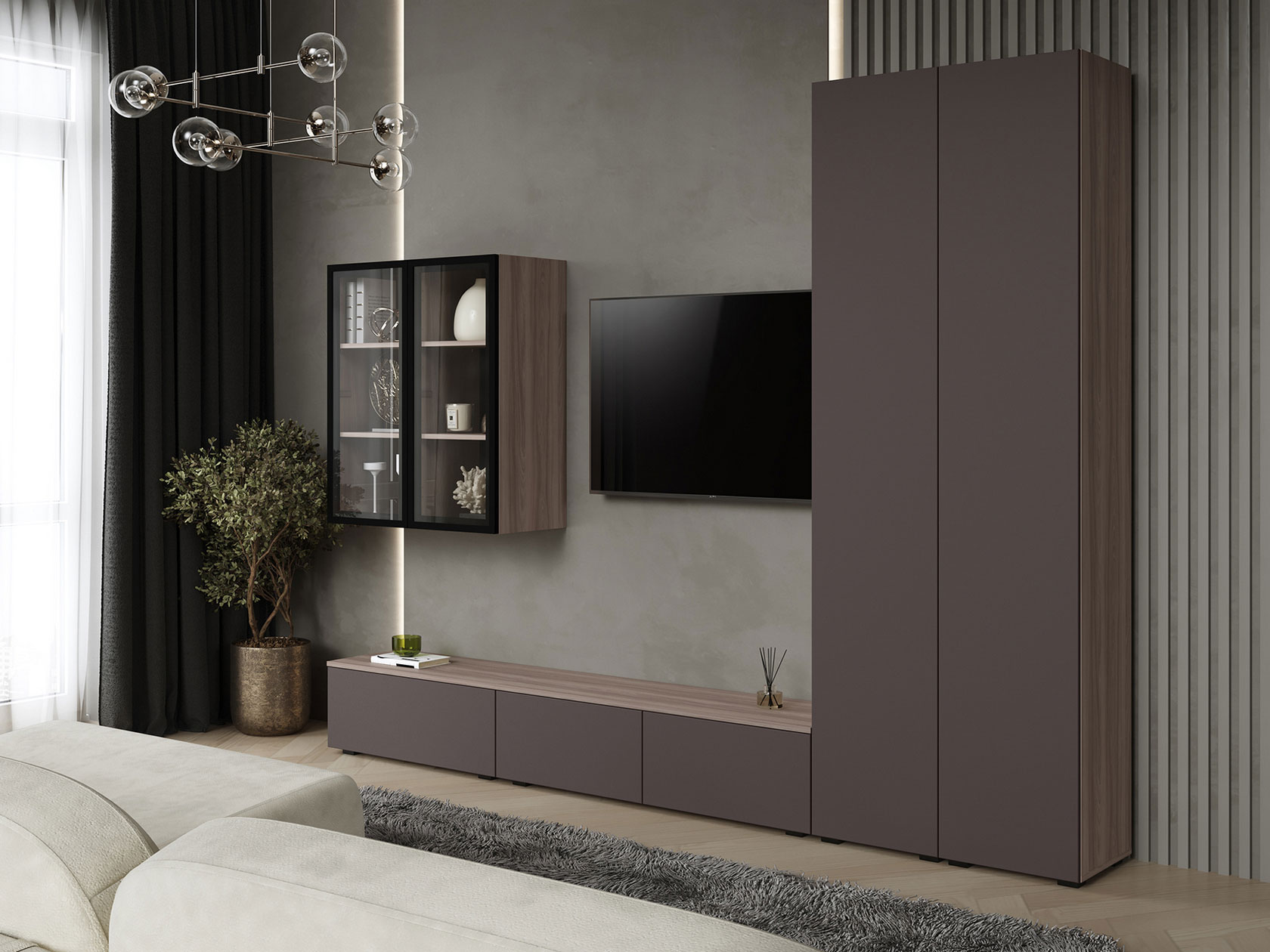 За стеклянными дверцами можно хранить книги, красивую посуду или декор, при этом защитив содержимое от пыли. ТВ-тумбы с выдвижными ящиками и распашные шкафы скроют от посторонних взглядов предметы обихода, аксессуары и бытовые мелочи. Гладкие фасады без фурнитуры создают минималистичный облик мебели, за которой, к тому же, легко ухаживать.